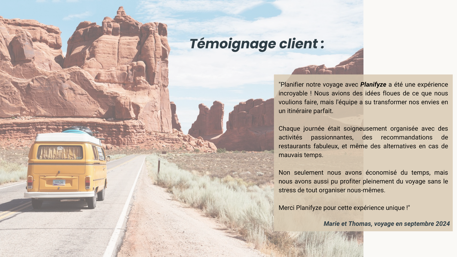 Planifyze Voyage Votre service de Travel Planner à un prix très abordable Voir nos offres attractives Un carnet de voyage complet et personnalisé Votre carnet de voyage numérique contient l’ensemble des informations nécessaires à un séjour personnalisé réussi !En tant qu’organisateur de voyage sur-mesure, nous ne réservons pas à votre place mais mettons à votre disposition les liens de réservation accessible grâce à notre carte interactive. Itinéraire complet Préparation d'un itinéraire personnalisé en fonction du type de voyage souhaité Hébergements adaptés Proposition de 3 logements en fonction des critères spécifiés Moyens de transport Proposition de différentes offres de transports Restauration Préparation d'une liste des adresses locales des meilleurs restaurants Informations pratiques Les informations pratique : papiers, devises, électricité ... Activités disponibles Activités proposées en fonction de vos centres d'intérêts et de vos envies Séjour de 3 jours en couple à Annecy Voir la carte intéractive Séjour de 7 jours en famille aux Iles Lofoten Voir la carte intéractive Road Trip de 14 jours en famille aux Etats-Unis Voir la carte intéractive Comment ça marche ? Choix de la durée du séjour Sélectionnez la durée idéale de votre séjour pour recevoir des suggestions qui s’intègrent parfaitement. Un week-end ? Une semaine ? Plus longtemps ? Partagez vos envies Dès que vous avez réglé votre formule, on vous envoie un questionnaire. Grâce à vos réponses, vous nous aidez à comprendre ce qui vous fait vibrer. Chaque détail compte pour nous ! Recevez votre guide PDF Chaque journée de votre programme inclut des suggestions de lieux et d’activités, des options de restauration et des alternatives en cas de changement de météo. Une carte intéractive avec les liens de réservation accompagne votre carnet de voyage Cliquez sur le logo pour suivre notre page instagram : Retours de voyageurs satisfaits